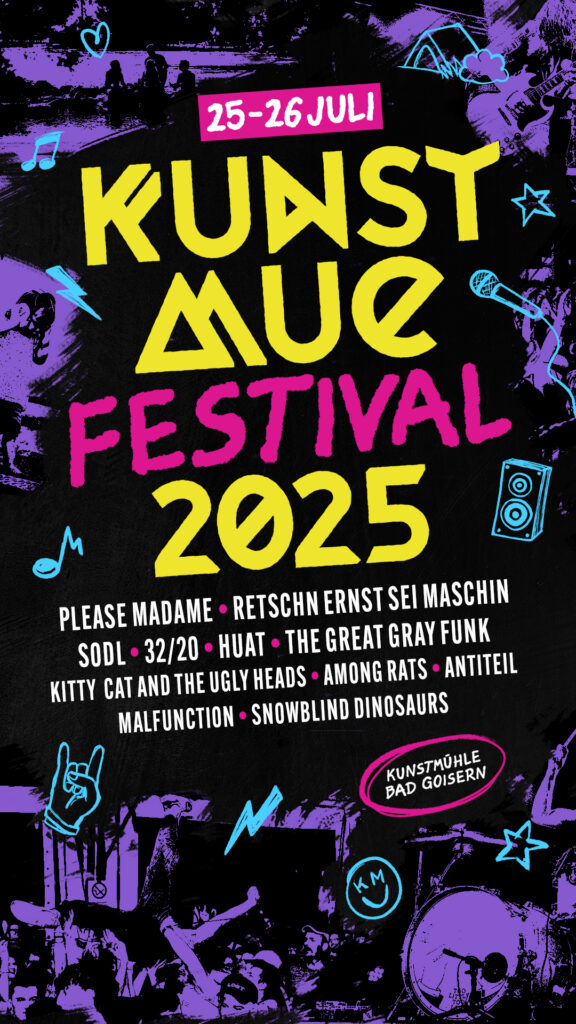 Das Kunstmue Festival ist ein seit über 20 Jahren bestehendes, ehrenamtlich organisiertes Musik- und Kulturfestival im Salzkammergut. Es bringt Menschen generationenübergreifend zusammen und verbindet harte Klänge wie Metal oder Punk mit sanfteren Tönen aus Indie und Alternative Rock. Neben einem abwechslungsreichen Musikprogramm bietet das Festival regionale Kulinarik, ein liebevoll gestaltetes Kinderprogramm und traditionelle Elemente wie den Frühschoppen. Dank freiem Eintritt und gratis Camping schafft das Kunstmue einen offenen, niederschwelligen Zugang zu Kultur – getragen von einer starken Community, die das Festival jedes Jahr mit viel Herzblut möglich macht.